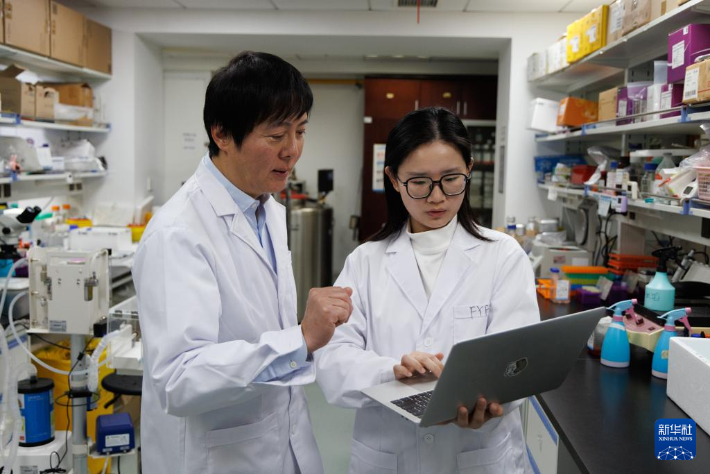 3月17日,在中国科学院分子细胞科学卓越创新中心(生物化学与细胞生物学研究所)实验室,程新研究员(左)和学生在一起交流。