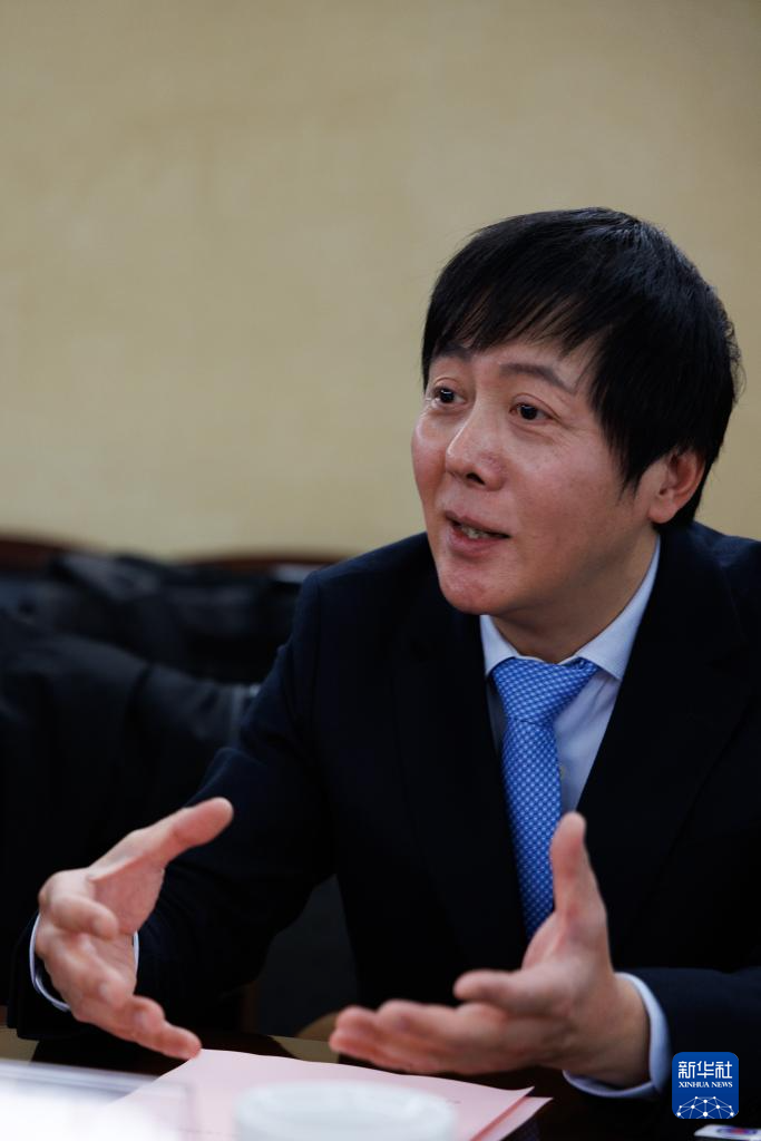 3月17日,在上海长征医院,殷浩教授(左一)接受记者采访。