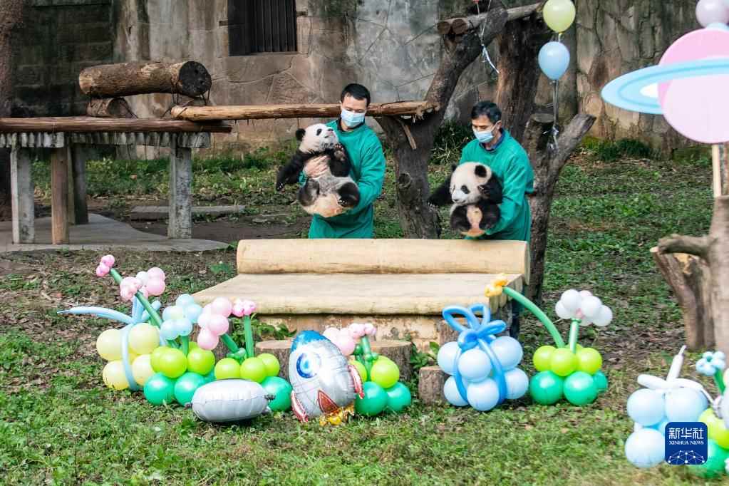 在当天的庆祝会上,“奇珍”和“奇宝”在彩色气球间荡着秋千。即日起,“奇珍”和“奇宝”将正式在重庆动物园大熊猫育幼室展出。展出分两个时段,分别是10时-11时、14时30分-15时30分。