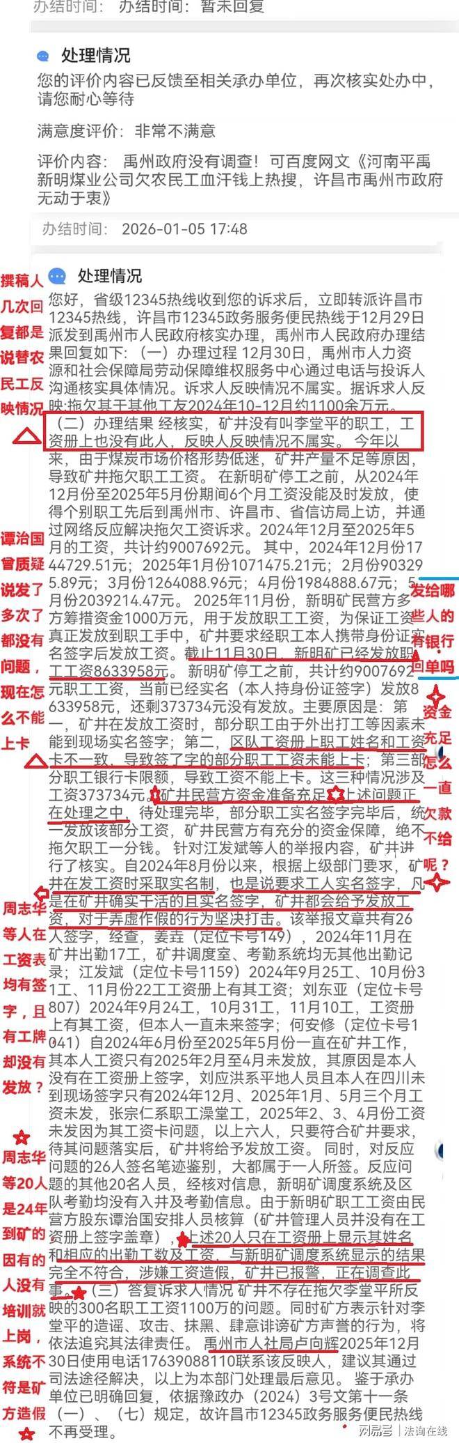 之后撰稿人通过豫事办投诉到禹州市田会卿市长,在撰稿人指出是代农民工投诉后再次回复却依然说是不欠撰稿人工资,只有6个人30多万元没有发。并且说明:矿井民营方资金准备充足!而对于其他的20多名人员则是说非矿井人员,涉嫌工资造假,矿井已报警。