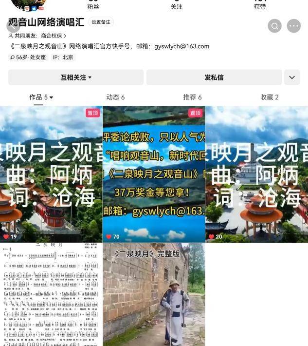 《二泉映月之观音山》是由沧海作词,采用阿炳的二胡乐曲制作的卡拉OK形似的视频在抖音、快手、视频号平台播放,吸引音乐爱好者进行演唱。广东观音山国家森林公园和北京中记文化发展中心联合举办的“《二泉映月之观音山》网络演唱汇”设置了冠军、亚军、季军各一名和10名优秀奖,举办方拿出了37万元奖金和多份观音山门票进行奖励。 据悉,作词者沧海先生将演唱《二泉映月之观音山》并发布网络,相当期待《二泉映月之观音山》的众多演唱者视听版本现诸网络。