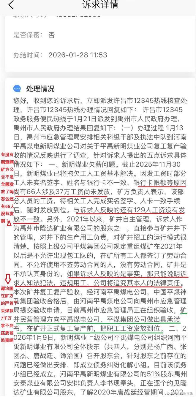之后撰稿人通过豫事办投诉到禹州市田会卿市长,在撰稿人指出是代农民工投诉后再次回复却依然说是不欠撰稿人工资,只有6个人30多万元没有发。并且说明:矿井民营方资金准备充足!而对于其他的20多名人员则是说非矿井人员,涉嫌工资造假,矿井已报警。