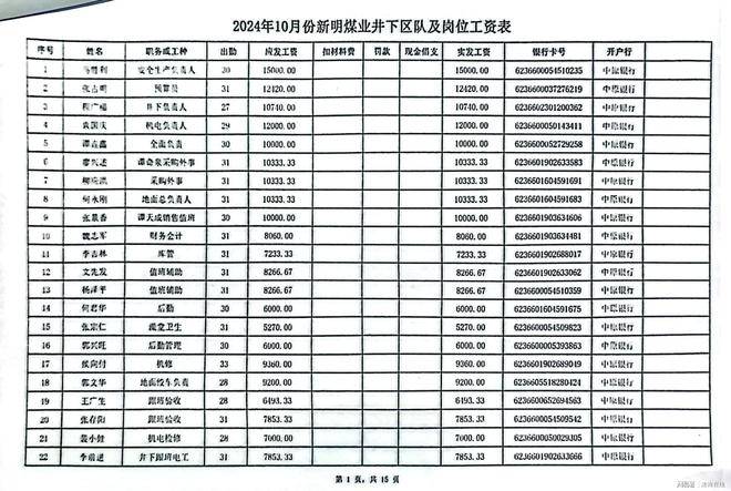 2024年10月工资表,有出勤天数应发工资和银行卡号。总共15页,计359人,其中有周志华应发工资12658.5元。