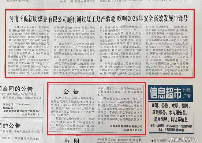 看看1月6日的《许昌日报》第二版“要闻”的公告吧,里面的公告显示拖欠的工人工资1173万元在2025年11月30日已全额发放。如果是这样,为什么那么多工人还多次到河南省信访局讨要工资呢?如此不负责任的公告,许昌日报审核了吗?再者,对于该版报道的《河南平禹新明煤业有限公司顺利通过复工复产验收 吹响2026年安全高效发展冲锋号》,谭治国表示是虚假新闻,将在春节后向河南省委宣传部举报。